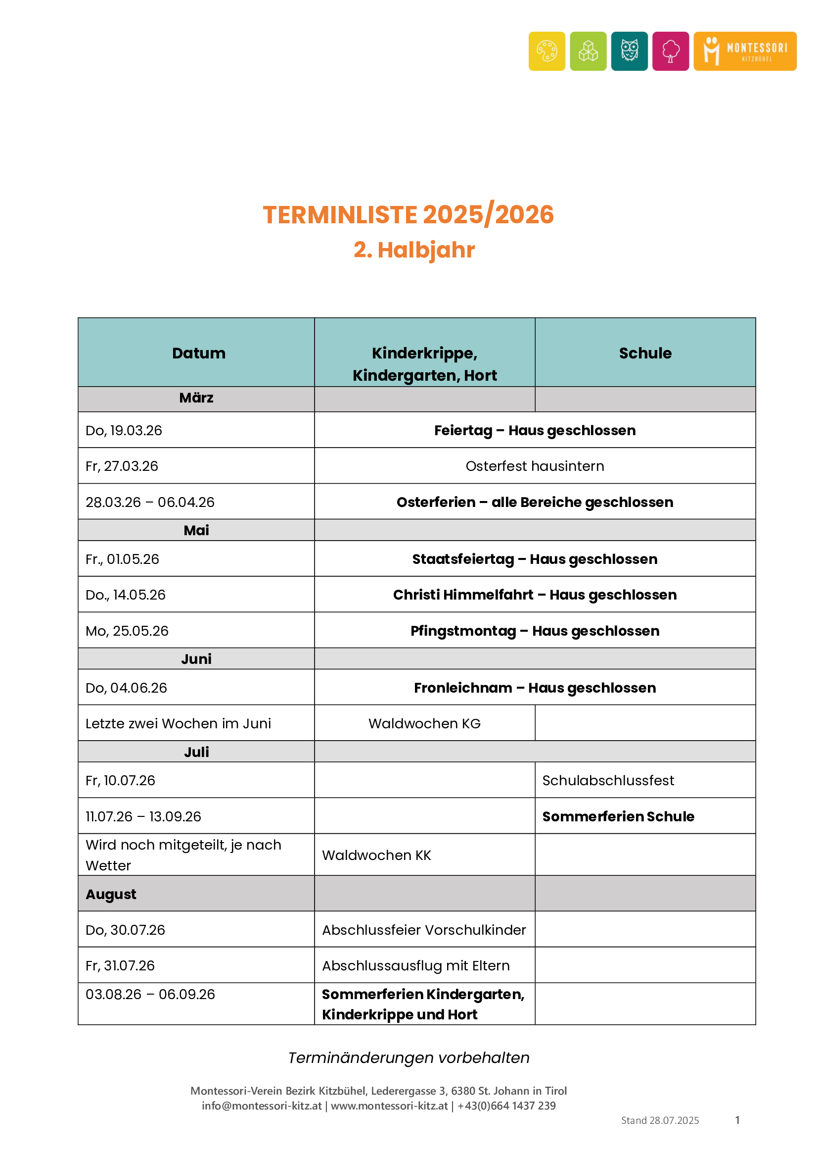 Terminliste 2. Halbjahr 25/26